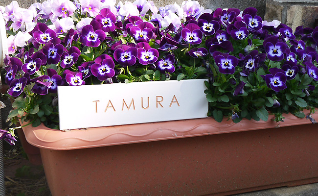上記の写真はパンジーの鉢に、長方形のタイル表札を立てかけてあります